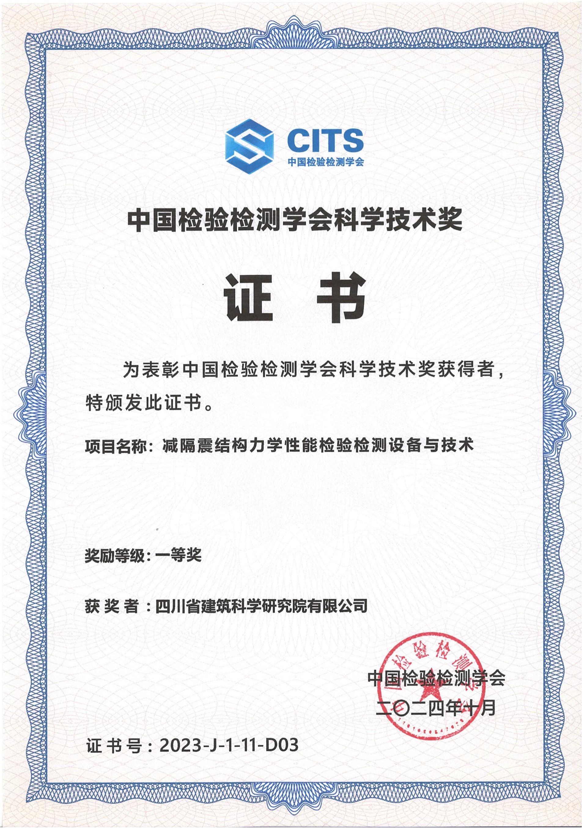 中國檢驗檢測學(xué)會科學(xué)技術(shù)進步獎一等獎-減隔震結(jié)構(gòu)力學(xué)性能檢驗檢測設(shè)備與技術(shù)
